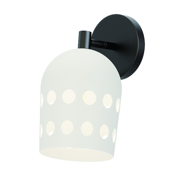 Retro configurations of Mid-Century Modern perforated metal designs inspire this collection of pendants, wall and ceiling mounts complete in a two tone powder coat finish. The spun metal shades are punched with large circular perforations that scatter a pattern of light when lit. Finished in a clean, two-tone Matte White and Black powder coat, these pieces add cheerful character to their space. The oversized shades on the wall sconce and portable lamps also feature a swivel joint that allow you to position the shade and direct the light with ease. A convenient switch on the back of the shade operates a 3-step dimmer to adjust the lamp's brightness at the touch of a button.