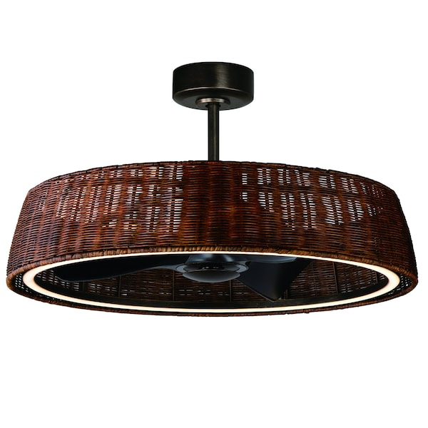 Hand woven rattan wicker in a natural or darkened finish are shaped into a sloping drum shade with an internal fan and LED light source within them. The contrasting Dark Bronze finish of the metalwork encases an LED ring toward the bottom edge of the shade allowing for a strobe-free light effect directed downward. The surface coatings are rated for outdoor applications so the rattan and the metalwork are purposefully designed for outdoor spaces under covered roofs. Transform your patio with coastal flair and escape the heat with this Fandelight by Maxim.