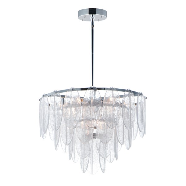 Hand formed glass petals suspend from a tiered frame of Polished Chrome. The glass is transparent yet cloudy, softly diffusing the light while creating a clean and crisp design.
