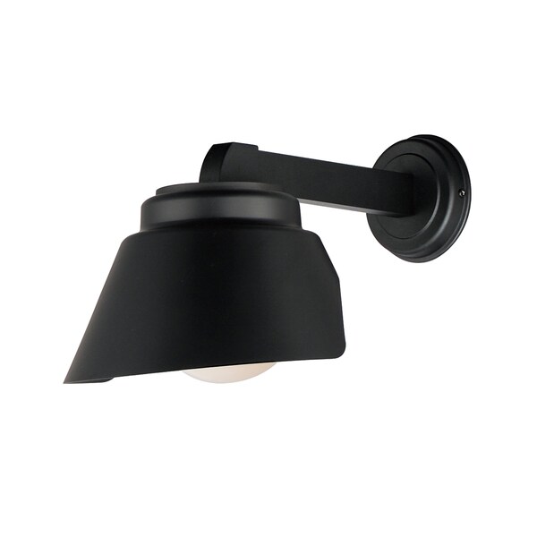 A white glass globe casts light that is hooded by a curved Black polycarbonate shade. The rectangular arm extends directly out, while the hooded shade cuts off light that would otherwise shine outward.