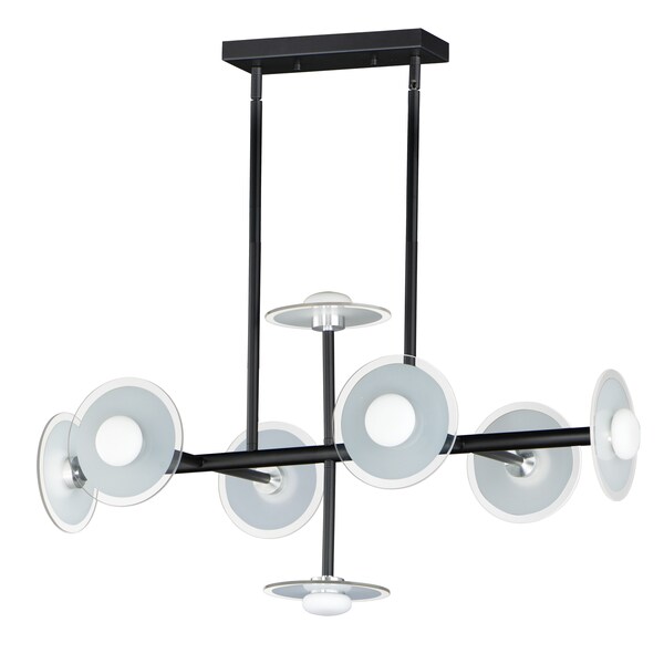 Simplistic frames of Black terminate at machined fittings that support round Frost glass discs with a clear reveal on the outside edge. Satin White glass diffusers conceal LED boards which provide ample light with excellent color rendition.