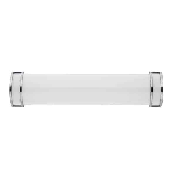 Commercial grade energy efficient lighting featuring linear frames of metal finished in Satin Nickel diffused by an etched opal acrylic creating an updated energy efficient classic.
