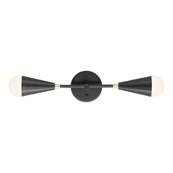 A classic mid-century look, the Lovell collection features two sizes of sputnik chandeliers and streamlined sconces perfect for bath vanity applications. Available in a Black/Satin Brass finish combination. Light bulbs nest inside the metal cones to become an element of the design.