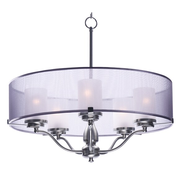 Drum shades constructed from two layers of sheer Organza fabric laminated to clear inner liner, allows light to shine out as well as down. White glass cylinder shades diffuse light and conceal the light source. Available in your choice of 2 finish combinations, Silver Sheer shade on Satin Nickel and Tan Sheer shade on Oil Rubbed Bronze.