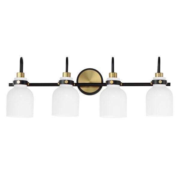 Celebrate nostalgia using these sconces that feature opal White glass shades in a bell shape. Supported on rings of metal in your choice of Polished Chrome or a bolder two-tone Black and Satin Brass, this refreshing take plays into a retro aesthetic of your bathroom decor. Available in various lengths of bath vanity lights or single sconces.