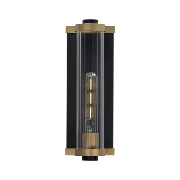 Internally ribbed clear glass tubes refract tubular lamps, creating a shimmering light effect. The glass is supported by a two-tone black frame with Aged Brass accents, making this sconce suitable for both indoor and outdoor installations. With a depthof less than 4 inches, this ADA compliant sconce may also be used in commercial applications..