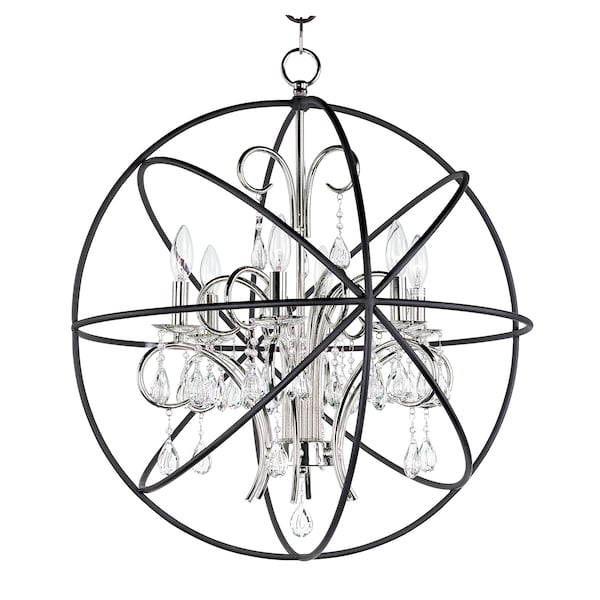 A spherical frame of metal surround a simple line chandelier draped in crystal for a transitional style that fits any interior design. Orbit is available in 2 sizes and 2 finishes, Oil Rubbed Bronze with Cognac crystal and a combo finish of Anthracite and Polished Nickel with Clear crystal.