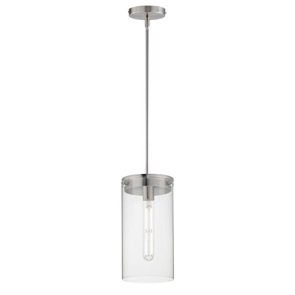 Simple clear glass cylinders are secured by decorative thumb screws in this transitional collection of sconces and pendants both neutral in design and suitable for damp applications. Choose from Satin Nickel or a two-tone Black and Satin Brass finish to pair with popular interior finishes in hardware, plumbing and decor.