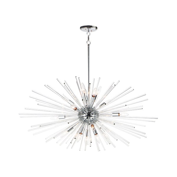 A dazzling burst of Clear glass rods extend from a classic sputnik shape finished in a bright Polished Chrome or warm Satin Brass. Available in two sizes of pendants and as a ceiling fixture, this unique look is a statement piece designed to attract attention.