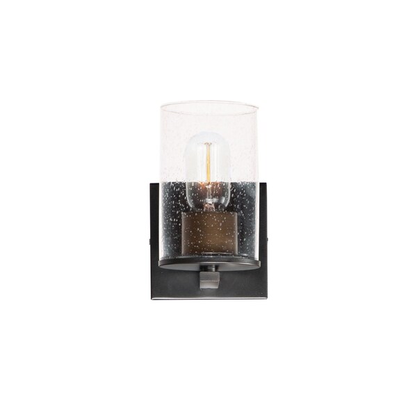 Cylinders in Clear Seedy glass on simple matte Black frames with Antique Brass socket covers. A clean and easily maintained fixture that easily coordinates with your stylish bathroom space.
