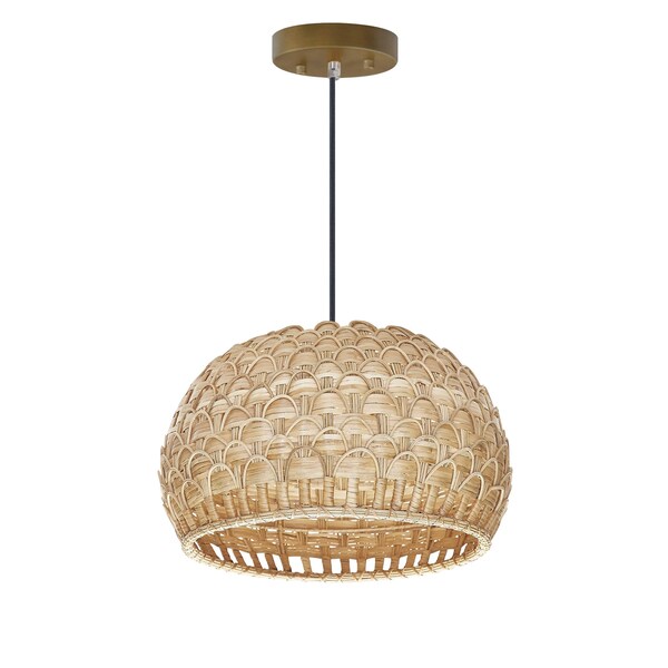 Woven bamboo strips are used to make a layered coastal pendant. Light escapes between the gaps in the material that is woven by hand that has a homespun warmth and natural appeal.