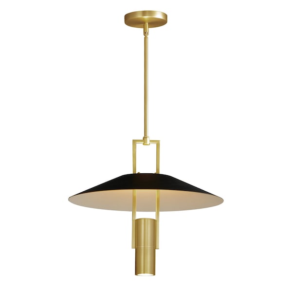 A refreshing take on reflector shades from the early days of Mid Century modern design, the Tahoe thoughtfully applies LED light to a classic concept. The LED housing that shines light against its metal shade painted white on its interior for better reflection is also punctured with a hole at its apex to cast light on the square-tubed yoke supporting it. Much more angular than the traditional reflecting up-light shaded pendant, this pendant brings more function to its fashion. A convenient LED lamp is also included facing down to illuminate the space below. Finished in a striking Black and Satin Brass combination, this pendant certainly calls attention while casually existing in its space.