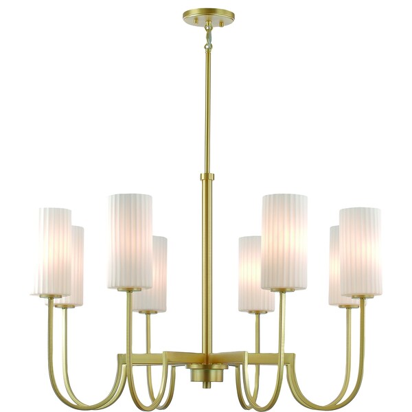 Whether in town or countryside, this collection of chandeliers simplifies the classic curved frame with a modern approach. Finished in your choice of Satin Brass or Matte Black, the sharply curved arms extend higher than classic proportions and support ribbed cylinders of opal white glass shades. These Satin White glasses upgrade pleated shades by form of their ribbed details. Available in two sizes of chandelier and a linear 4-light pendant, this collection finds its place at home in a variety of applications and fits in regardless of whether its town or country.