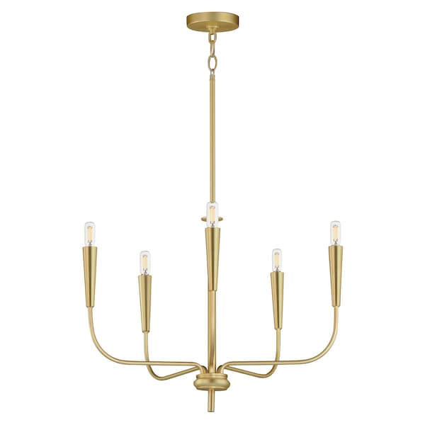 A simple candle style chandelier is given a modern edge with tall tapered candle covers that sit at the ends of curved arms without a bobeche beneath them. Available in Satin Brass or Matte Black, the collection compliments many architectural interiors and allows for creative styling through the selection of lamp type. Pair with our T6 lamp for more modern, industrial flair or classic candelabra for a clean, transitional look. This series provides a convenient new take on the candle chandelier with subtle and unique design details.