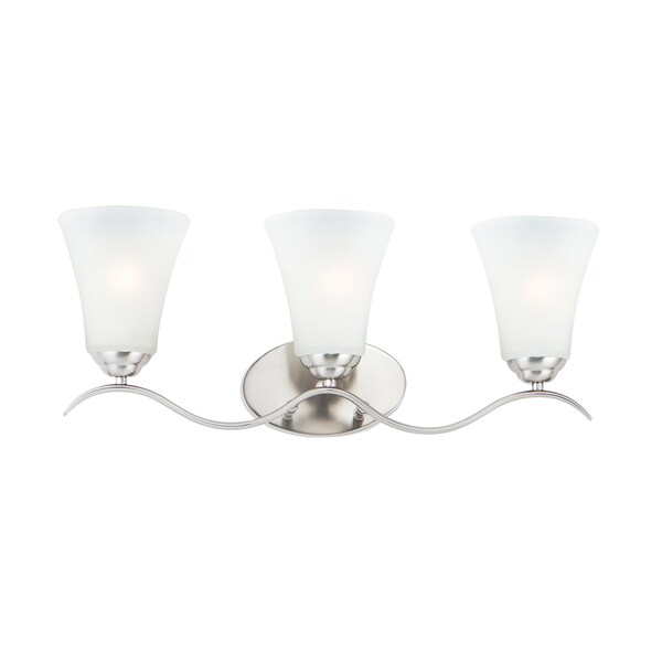 Gently waving arms of Satin Nickel or Oil Rubbed Bronze support tall-profile Frosted glass shades creating a scale normally not found in this category of lighting. The bath vanity may be installed up or down and also includes a Polished Chrome finish.