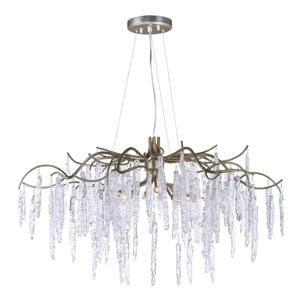 Metal is formed in a branch-like design and finished in a rich Silver Gold. Handmade pendants of Piastra like Ice glass are draped from the frame to complete this designer look.