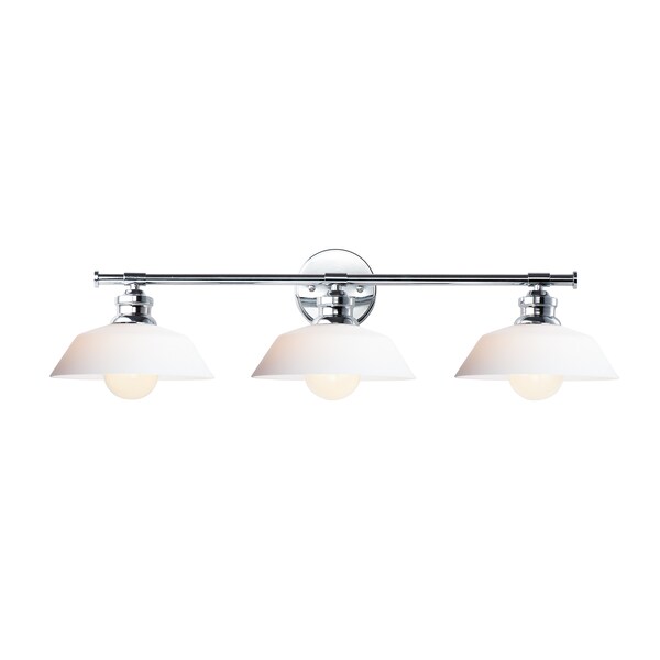 Satin White cased glass shades in an RLM shape are mounted to a nostalgic Polished Chrome frame to create this clean and classic look. The larger scale glass sets this look apart and makes a statement over the vanity.