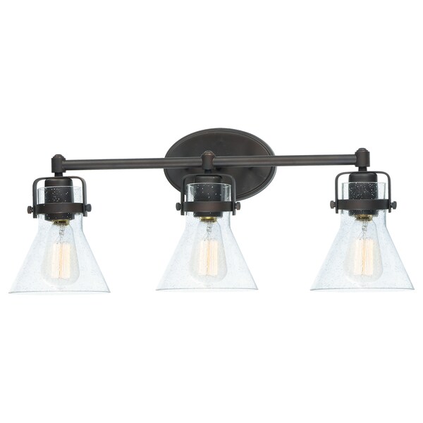 This Nautical-Inspired Bath Vanity Features Clear Seedy Glass Cones Suspended By A Yoke Frame Finished In Polished Chrome. The Clear Glass Offers Abundant Lighting And Compliments The Styling Of The Fixture. Make It A More Industrial Look By Adding Filament E26 Light Bulbs.