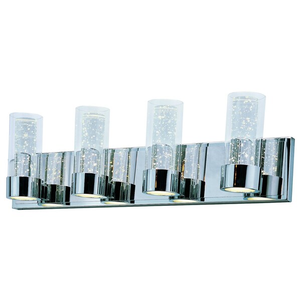 Rods of bubble glass are encased inside a Clear glass cylinder, which are supported in a cast Polished Chrome frame. Dual LED modules bring the bubble glass to life, while also providing ample illumination to the surface below.