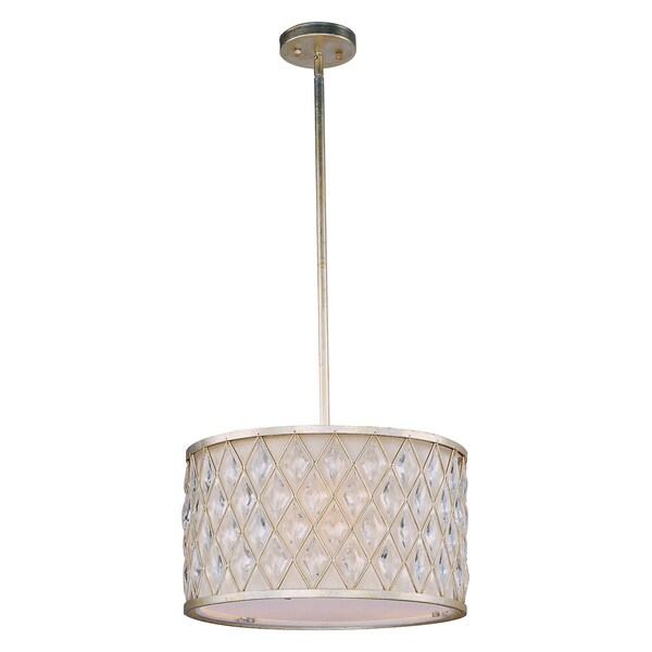 Diamond-shaped crystals gracefully fit the openings in these metal frames finished in a rustic Golden Silver finish, and creamy Off White fabric shades line each frame of the Diamond collection. The oval-shaped pendant is sure to be the focal point of any fine décor.