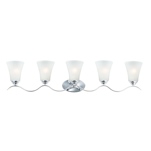 Gently waving arms of Satin Nickel or Oil Rubbed Bronze support tall-profile Frosted glass shades creating a scale normally not found in this category of lighting. The bath vanity may be installed up or down and also includes a Polished Chrome finish.