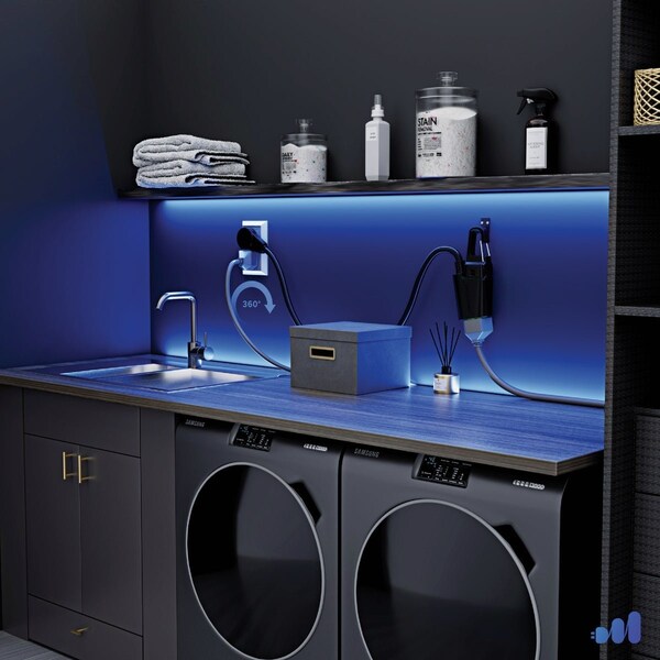 Patented 360-degree rotating flat plug (15mm thick). SJT (Stranded Copper Wire) 13-amp maximum 1625 watts 125-volt AC.1-outlet NEMA 5-15P grounded plug with lighted 3-pin female NEMA 5-15R connectors. Removable hook. UL certified: Tested safe for use and passed industry standard.