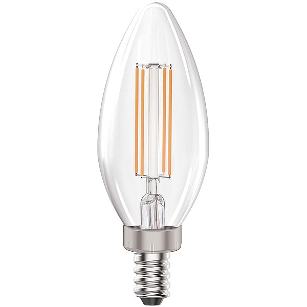 LED Lamp, Bulb Shape B10, Dimmable Yes, Glass Bulb Housing, Bulb Base Type Candelabra Screw (E12), 4.0 Watts, Wattage Equivalency 40W INC, Bulb Color Temp. 2700K, LED, Light Appearance 2700 to 2999K, Soft White, Average Bulb Life 15,000 hr., Color Rendering Index 82, Bulb Type Decorative, Bulb Beam Angle 360 Degrees , Lumens 330, Light Distribution Omnidirectional, Voltage 120, Max. Overall Bulb Length 3-19/32 In., Light Bulb Dia. 1-1/4 In.