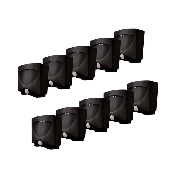The 10 pack of Maxsa motion-activated outdoor night-lights shines a light when and where you need it most: an entryway,your steps, a hallway, attic or basement. The built-in motion detector senses movement within a 10 feet radius, and flips on only when it's needed. An integrated light-sensor activates the unit at dusk to conserve battery power. The three LED lights will remain on as long as motion continues to be detected and will remain on for approximately 30 seconds after the last detected movement. The light is battery-powered (3 AA Batteries not included) and simple to install. It's also durable and weatherproof, so it can be used both outdoors and indoors. Dark Brown.