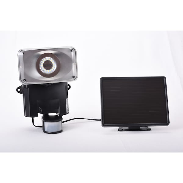 New Surface Mount LED Technology makes this our brightest solar motion light. 20 pieces of 0.5 Watt Surface Mount LEDs means Motion-Activated Solar Security Light automatically turns on when motion is detected after dusk, producing over 1100 lumens. Includes a 3.7 V 4.4 Ah Li-ion rechargeable battery pack, solar charging panel, and 15-feet cable. Activates up to 120 times when on for 30 seconds at a time. Black finish.