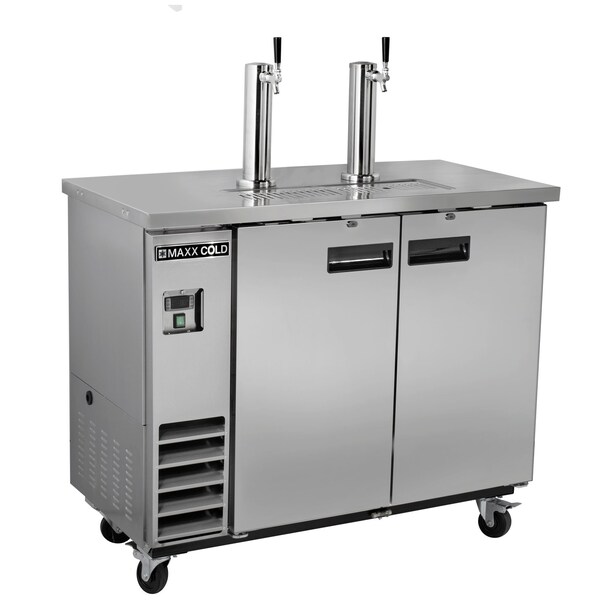 Maxx Cold X-Series Beer Tower Dispensers feature a sanitary stainless steel top and exterior for durable performance and easy cleaning. Forced air refrigeration system distributes cold air evenly to keep contents cooled. Two standard 3-inch polished stainless steel draft tower dispensers are mounted to the top center counter and are cooled by continuous cold air circulation to maintain tap temperature that reduces foam when dispensing.
