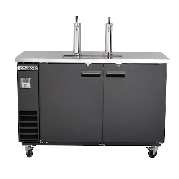 Maxx Cold X-Series Beer Tower Dispensers feature a sanitary stainless steel top and exterior for durable performance and easy cleaning. Forced air refrigeration system distributes cold air evenly to keep contents cooled. Two standard 3-inch polished stainless steel draft tower dispensers are mounted to the top center counter and are cooled by continuous cold air circulation to maintain tap temperature that reduces foam when dispensing.