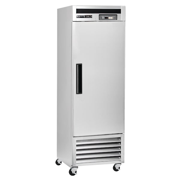 Maxx Cold Single Door Reach-In Freezer, one section, 23 cu. ft., (3) wire shelves, interior light, digital temp control, automatic defrost, (1) solid hinged door with recessed handle, stainless steel interior and exterior, (4) 4 in. swivel casters, bottom mount compressor, self-contained, 1/3 HP.