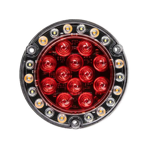 Stop/Tail/Turn/Back-Up Light, Lighting Technology LED, Light Type Stop, Turn, and Tail Combination Light, Lens Color Amber, Red, Clear, Shape Round, Overall Diameter 5 1/2 in, Overall Height Not Applicable, Overall Width Not Applicable, Overall Depth 1/2 in, Current 0.6 A, Electrical Connection Blunt Cut Wires, Compatible Electrical Connection Grainger Part Number Not Applicable, Compatible Electrical Connection Manufacturer Model Number Not Applicable, Mount Type Flange, Mount Style Surface