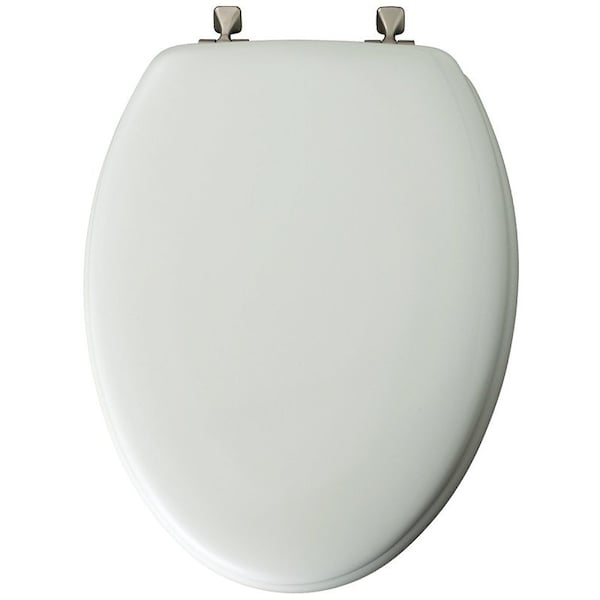 This molded wood seat provides durability and stability. The brushed-nickel metal hinges are stylish and long-lasting. With the STA-TITE seat fastening system, the seat does not shift around and stays firmly attached to the toilet. For residential use only. Made in USA.