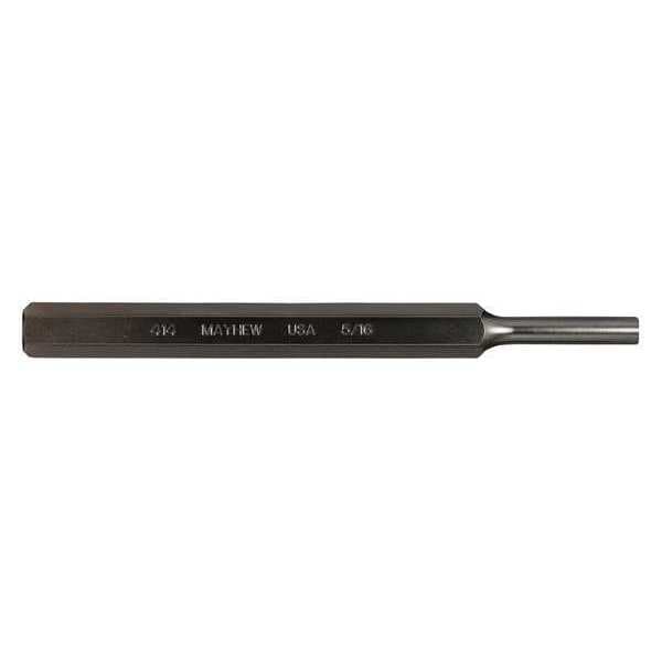Pin Punch, Automatic No, Punch Type Pin Punch, Tip Size 5/16 in, Tip Type Flat, Shank Shape Hexagon, Shank Width 1/2 in, Grip Style Plain, Hole Diameter 5/16 in, Overall Length 6 in, Container Type Bulk, Material Applications Metal, Includes Striking Cap No, Measurement Type SAE, Includes Handguard No, Taper Length 1 1/4 in, Tether Ready No, Includes Handle No, Corrosion-Resistant Yes, Features Pin Punches are Used to Drive Out and Remove Loosened Pins and Key, Finish Black Oxide, Insulated No