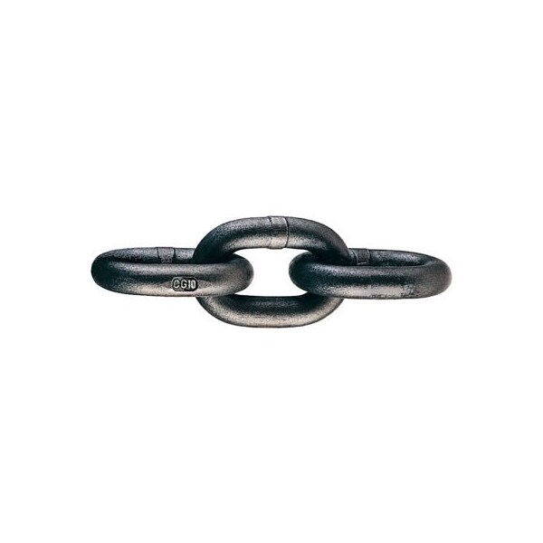 Features: spectrum 10 alloy chain alloy steel. Heat treated. 25% stronger than grade 80 alloy chain. Permanently embossed with cg (crosby group) and 10 (grade). Finish - black rust preventative coating. Proof tested at 2 times the working load limit with certification. Standard container - fiber drum. Grade 100 alloy chain recommended for overhead lifting applications