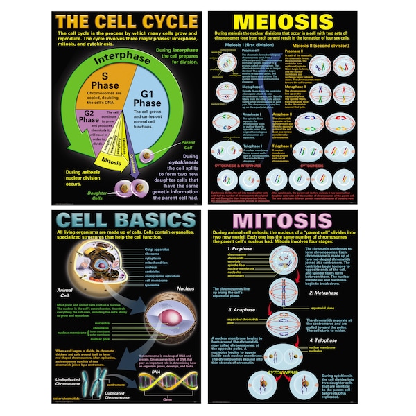 Help students learn about the "building blocks" of life with these posters that teach the main parts of a cell and the phases of the cell cycle. The posters also clearly describe and illustrate the stages of mitosis and meiosis. The set contains four 17" x 22" posters, four reproducible activity sheets, and a teacher's guide.