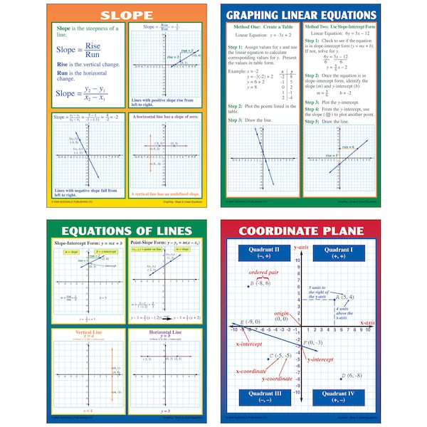 These informative posters help teach students about coordinate planes, equations of lines, slope, and methods for graphing linear equations. Package includes 4 posters, 4 reproducible activity sheets, and a teacher's guide. Each poster measures 17" x 22".