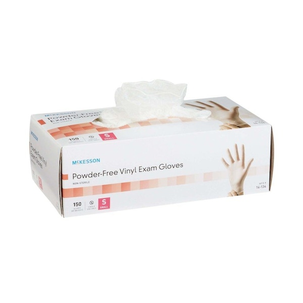 Exam Glove McKesson Small NonSterile Vinyl Standard Cuff Length Smooth Clear Not Rated McKesson powder-free vinyl exam gloves protect your hands during patient exams This disposable medical product is not sterile Use a pair of these clear exam gloves for one patient exam only The gloves have standard cuffs and rolled edges for easy on and off Wear McKesson vinyl exam gloves on either the right or left hands The smooth inner and outer surfaces create a comfortable fit for a natural touch These size small powder-free exam gloves are not made for use with chemotherapy