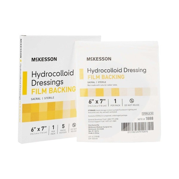 Hydrocolloid Dressing McKesson 6 X 7 Inch Sacral Sterile McKesson hydrocolloid dressing creates a moist environment that boosts healing Highly absorbent inner layer that absorbs wound exudates The 6- by 7-inch dressing is light beige and semi-transparent to provide visualization Outer layer is moisture resistant to prevent contamination 7-day wear time with a film backing