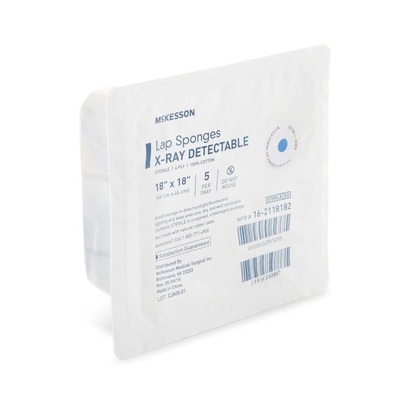 Surgical Laparotomy Sponge McKesson X-Ray Detectable Cotton 18 X 18 Inch 5 Count Hard Pack Sterile Hard pack 100% cotton X-ray detectable Sterile 18 x 18 inches