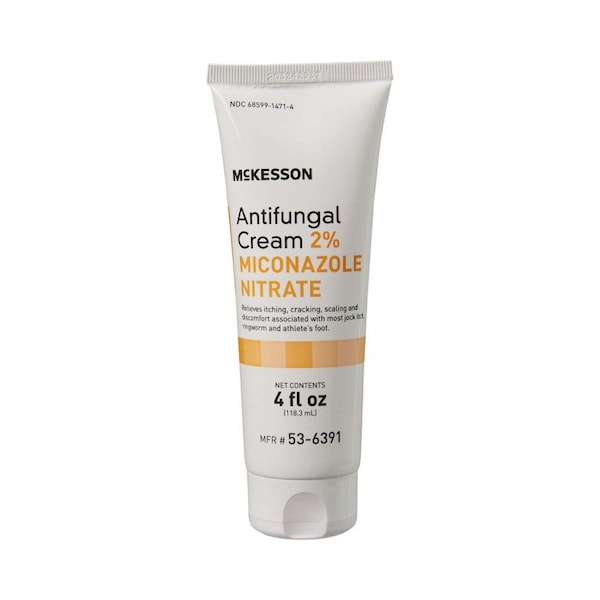 Antifungal McKesson Brand 2% Strength Cream 4 oz. Tube McKesson antifungal cream treats most types of athlete's foot, jock itch, ringworm and other fungal infections 2% miconazole nitrate cream can help itching, chafing, scaling, cracking, burning, soreness, redness, irritation Relieve your skin from redness, soreness and feelings of burning Ease discomfort from itchy, scaly and cracked skin with this antifungal cream Apply this product directly to the affected areas of your skin 4 oz. tube