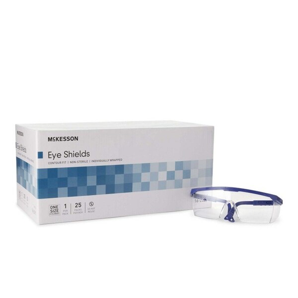 Protective Glasses McKesson Brand Side Shield Clear Tint Blue / Clear Frame Over Ear One Size Fits Most Nonsterile Feature clear lenses and are lightweight and comfortable to wear Eye shields are designed to provide eye protection from splashed or sprayed body fluids Top and side shields protect eyes from virtually every angle Contour fit Individually wrapped, in a convenient dispenser box