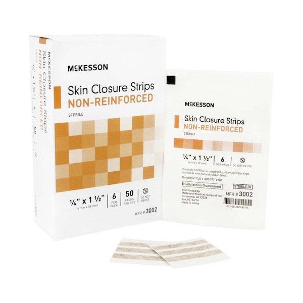Skin Closure Strip McKesson 1/4 X 1-1/2 Inch Nonwoven Material Flexible Strip Tan Non-Reinforced flexible strips 1/4-inch x 1-1/2-inch 6 mm x 38 mm Tan Ideal for closing small cuts and wounds Unique microporous construction is designed to permit skin ventilation and prevent maceration Easy to apply and comfortable to wear Flexible material conforms to the skin Skin-friendly adhesive Sterile