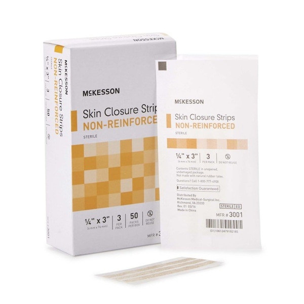 Skin Closure Strip McKesson 1/4 X 3 Inch Nonwoven Material Flexible Strip Tan Non-Reinforced 1/4-inch x 3-inch 6 mm x 76 mm Tan Ideal for closing small cuts and wounds Unique microporous construction is designed to permit skin ventilation and prevent maceration Easy to apply and comfortable to wear Flexible material conforms to the skin Skin-friendly adhesive Sterile