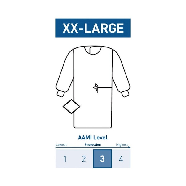 Non-Reinforced Surgical Gown with Towel McKesson 2X-Large Blue Sterile AAMI Level 3 Disposable Size 2X-large with 53 Inch length Blue AAMI Level 3 Provides moderate-to-high level protection for operating room personnel and surgical patients from the transfer of microorganisms, bodily fluids and particulate Triple-density, SMS material provides excellent barrier strength, protection and breathability Intuitive rear pleats, generous cuts and raglan-sleeve design provide increased range of motion and enhanced comfort Extra-long hook-and-loop feature creates an adjustable fit around the neckline, aids in donning, and maximizes comfort Set-in sleeve designs with knit cuffs feature generous cuts and intuitive rear pleats for enhanced comfort and movability Included transfer tag and waist ties for easy donning and notetaking for convenience in the sterile field