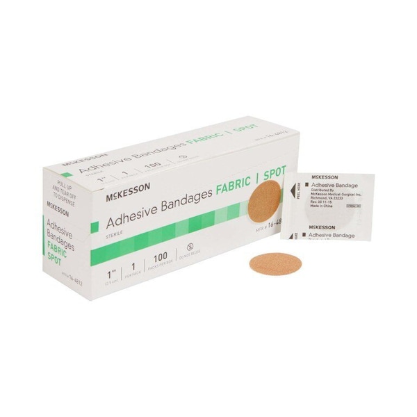 Adhesive Spot Bandage McKesson 1 Inch Fabric Round Tan Sterile Flexible, durable fabric helps protect cuts and scraps Absorbent, non-stick pad is stretchable and conforms to the skin Adhesive is long lasting and feels comfortable Comes in a sterile individual package to help promote cleanliness 1-inch diameter