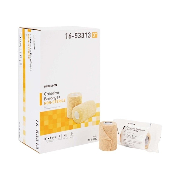 Cohesive Bandage McKesson 3 Inch X 5 Yard Standard Compression Self-adherent Closure Tan NonSterile This self-adherent cohesive bandage keeps dressings, gauze and sponges in place The bandage stays in place without requiring the use of adhesives, clips or fasteners It conforms to the natural shape and contours of the body for flexibility and secure fastening The McKesson cohesive bandage delivers light compression and soft tissue support to help facilitate healing Each tan roll is 3 inches x 5 yards