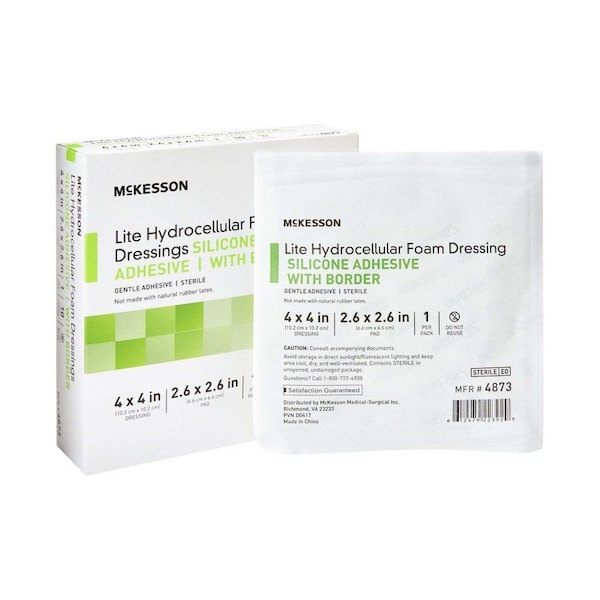 Thin Silicone Foam Dressing McKesson Lite 4 X 4 Inch Square Silicone Gel Adhesive with Border Sterile A silicone gel adhesive keeps them securely in place and peels off with minimal disturbance The gel sticks to the surrounding dry skin instead of the wound bed for added comfort The dressings form a leak-resistant seal A breathable outer film layer allows airflow while keeping out moisture and bacteria An inner foam pad is 2-3/5 inches square and absorbs fluid for further leak protection The 4-inch by 4-inch silicone gel adhesive dressings retain adherence when removed and repositioned Wounds retain moisture, making healing faster