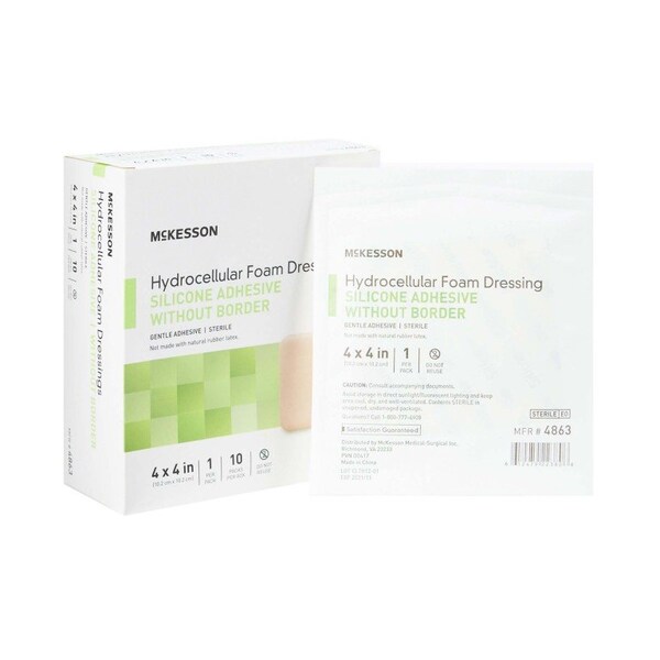 Silicone Foam Dressing McKesson 4 X 4 Inch Square Silicone Gel Adhesive without Border Sterile Accommodates both acute and chronic wounds with moderate levels of exudate Suitable for venous leg ulcers, pressure ulcers, diabetic ulcers and traumatic wounds Designed to affix to dry, intact skin to maintain a moist wound environment and promote healing Outer film layer is breathable while remaining resistant to bacteria and moisture infiltration Inner hydrocellular foam pad is absorbent Seals the wound margins to help prevent exudate from leaking on surrounding tissue Highly conformable to fit on human body's contours Perforated silicone gel adhesive minimizes pain and trauma to wounds upon removal